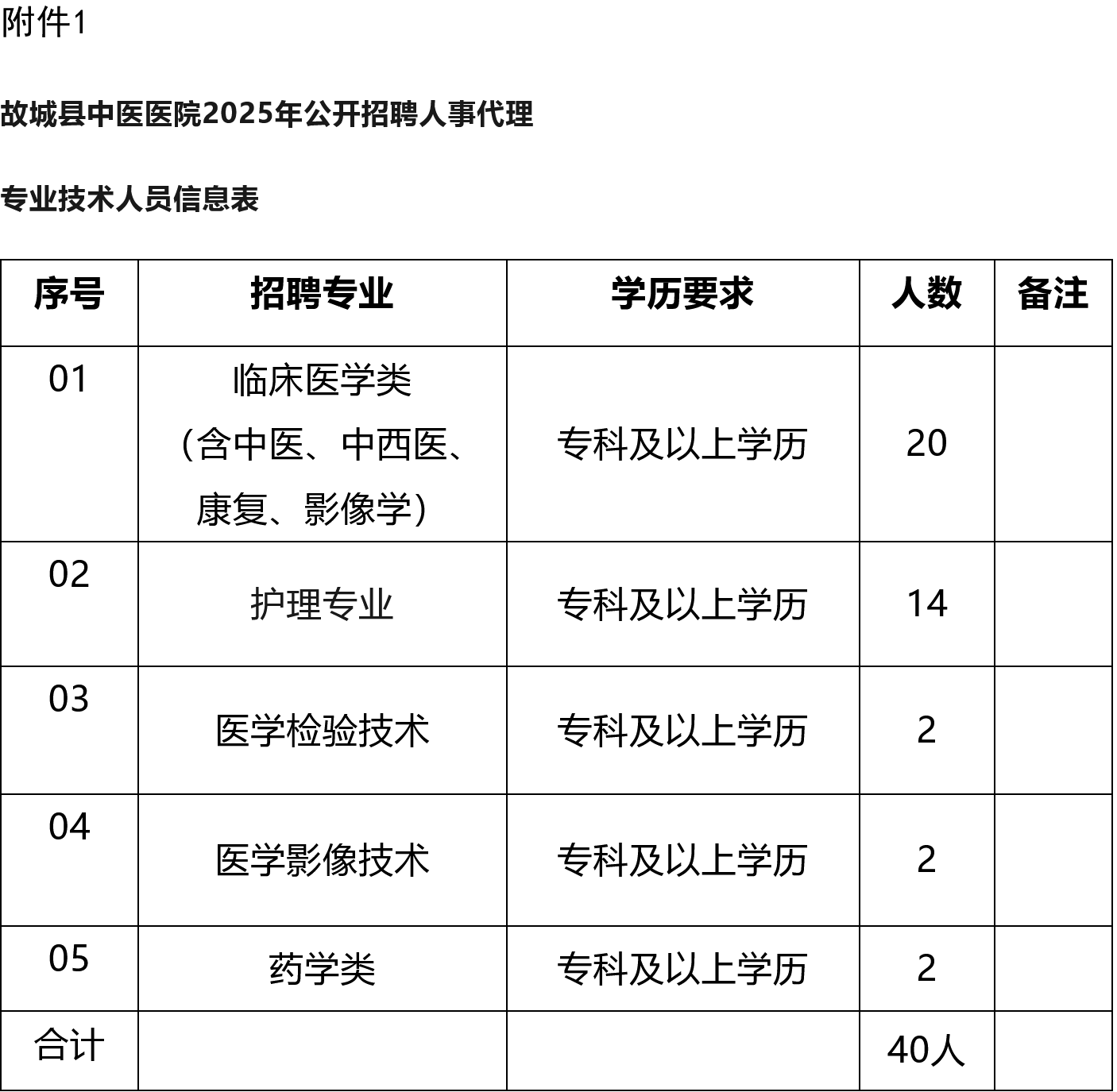公开招聘人事代理专业技术人员48名。其中故城县中医医院招聘40名,县妇幼保健院招聘8名,招聘专业、数量及要求详见《故城县中医医院、故城县妇幼保健院2025年公开招聘人事代理专业技术人员信息表》(附件)。