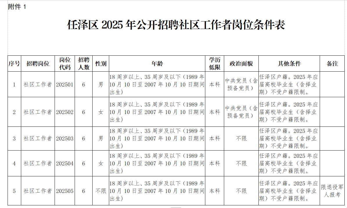 附件1.任泽区2025年公开招聘社区工作者岗位条件表