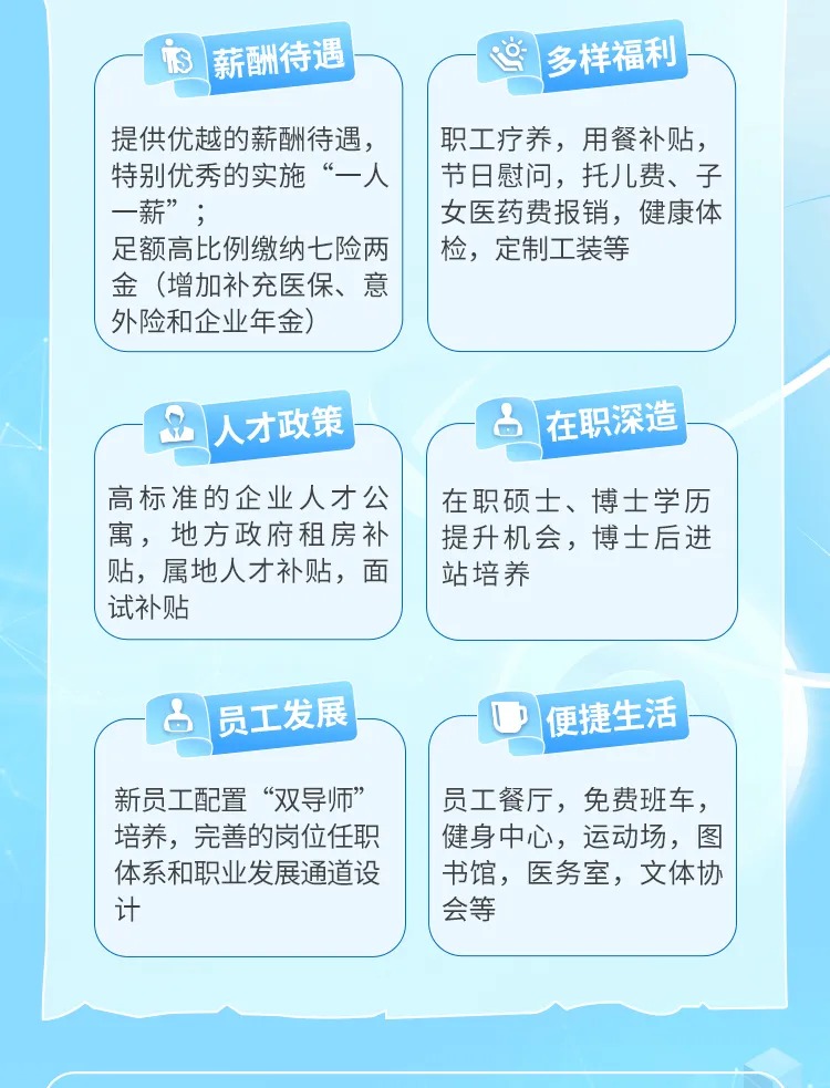 这里为大家提供“七险两金”、补充医疗保险、交通意外险和企业年金,还有托儿费、子女医药费报销、健康体检、租房补贴、人才补贴、面试补贴…系列福利。