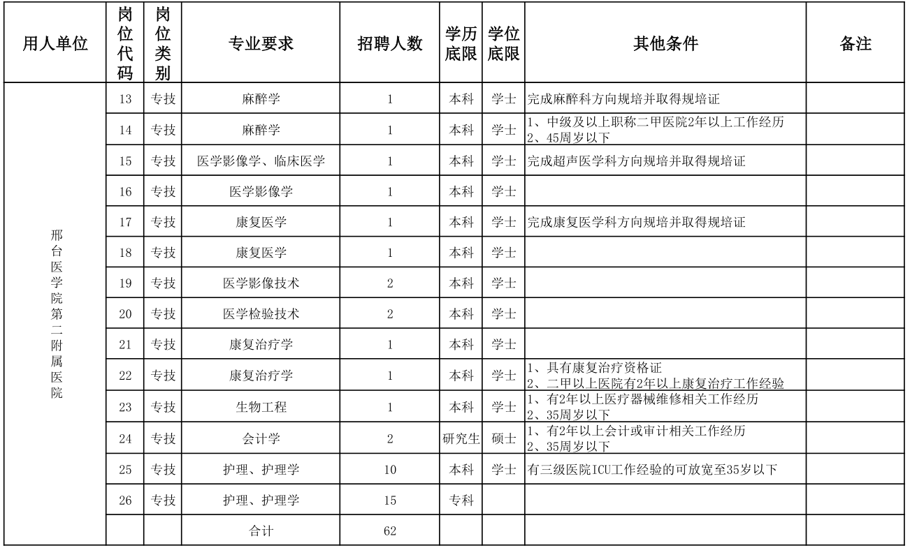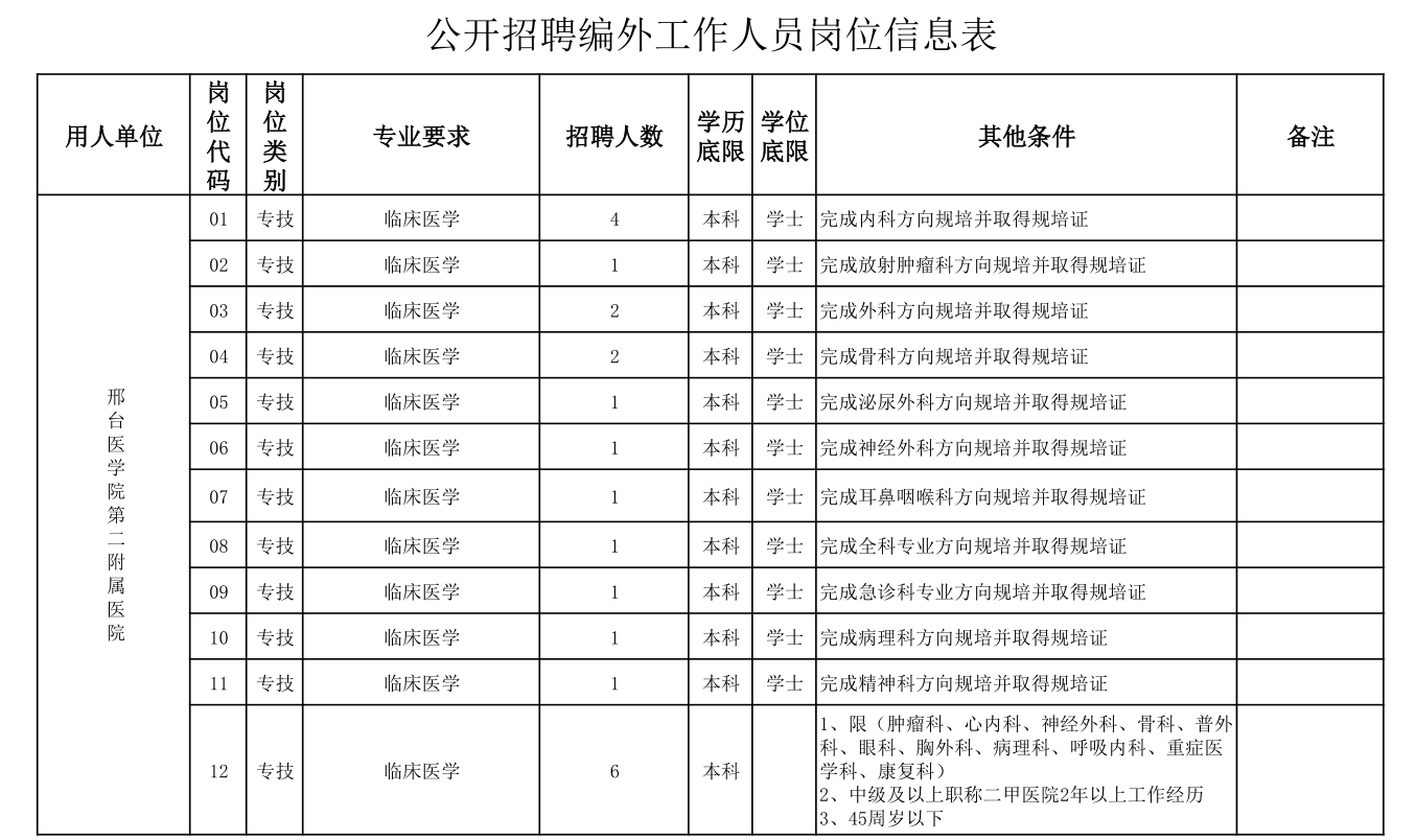 1.具体招聘人数和岗位条件详见《邢台医学院第二附属医院公开招聘编外工作人员岗位信息表》,其中专业参考教育部《授予博士、硕士学位和培养研究生的学科、专业目录》《普通高等学校本科专业目录》《普通高等学校高等职业教育(专科)专业目录(2015年)》设置。
