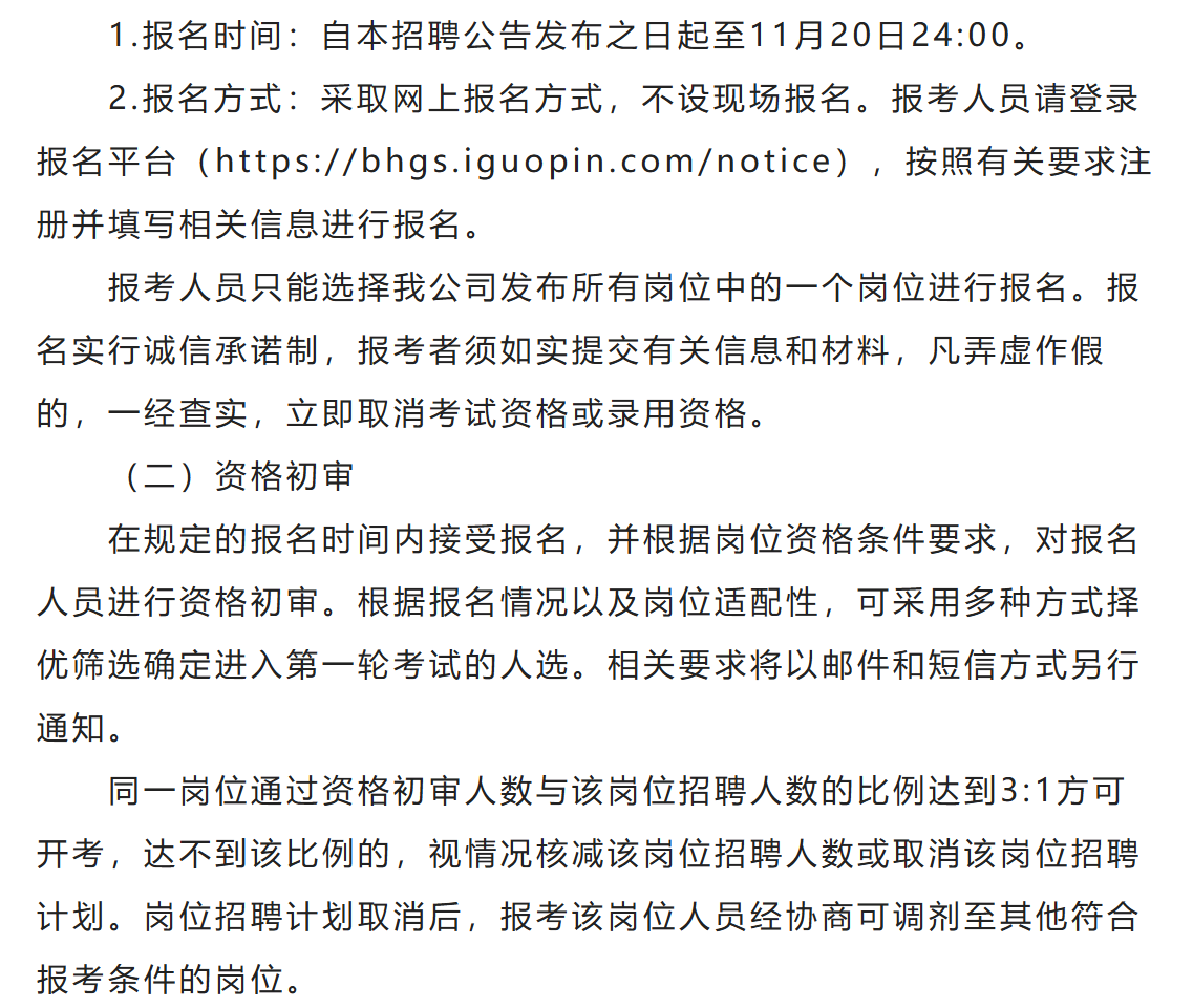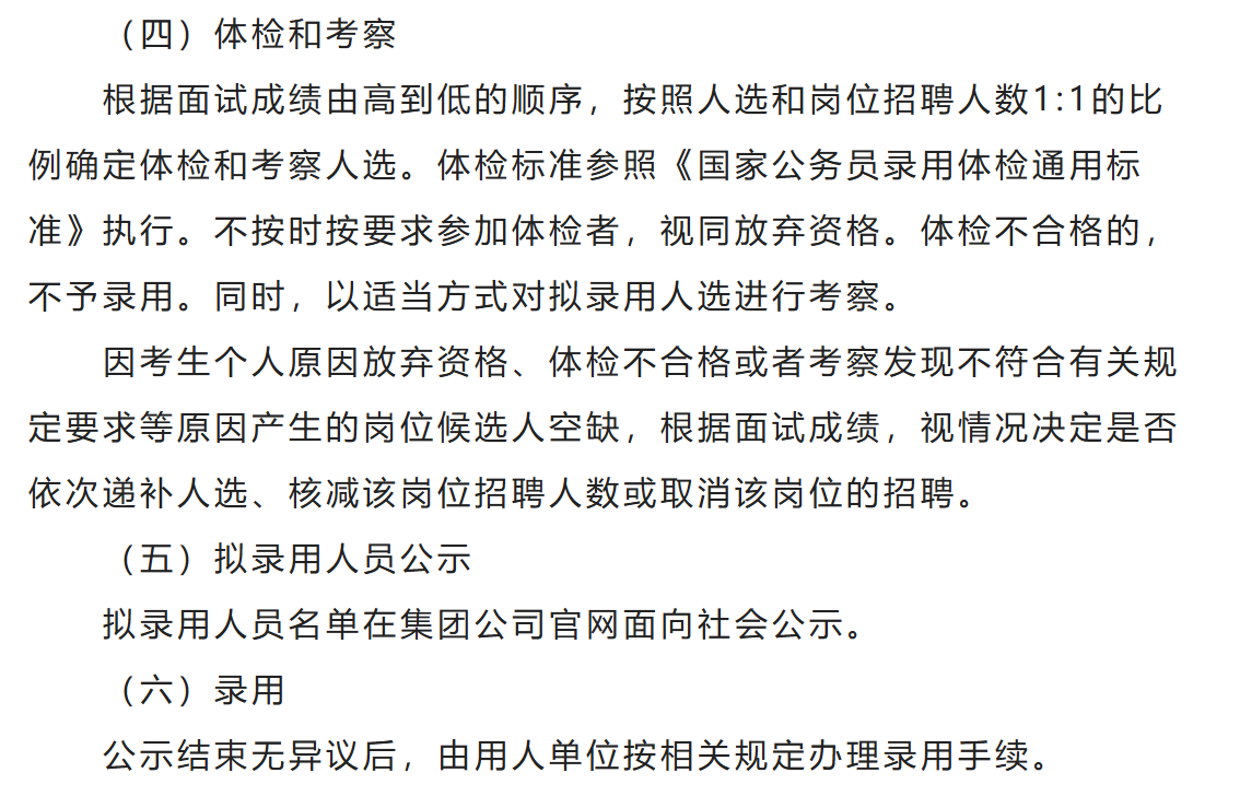 2.第二轮面试。根据第一轮线上笔试成绩排序,每个岗位按照拟招聘人数与进入面试人数比例1:5选取进入第二轮面试的人员;未达到1:5的,则该岗位参加笔试人员全部进入第二轮面试。第二轮面试方式有关具体事宜将通过邮件和短信等形式进行通知,请考生务必保持手机及邮箱畅通,及时关注。因面试人员不满足应聘岗位需求或岗位竞争力不足的,可对相应岗位招聘人数进行核减或取消该岗位招聘。